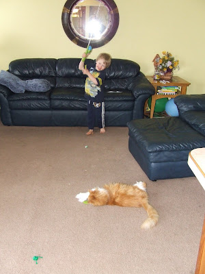 Tyler got his first fishing pole this year and has been using his Buzz Lightyear pole to reel in Nugget. So far, Nugget has been game for the game every time the pole is brought out. It is so cute hearing Tyler's giggles and seeing Nuggie make his move! I never in a million years would have thought that Nugget would make nice with the kids. Sweet.